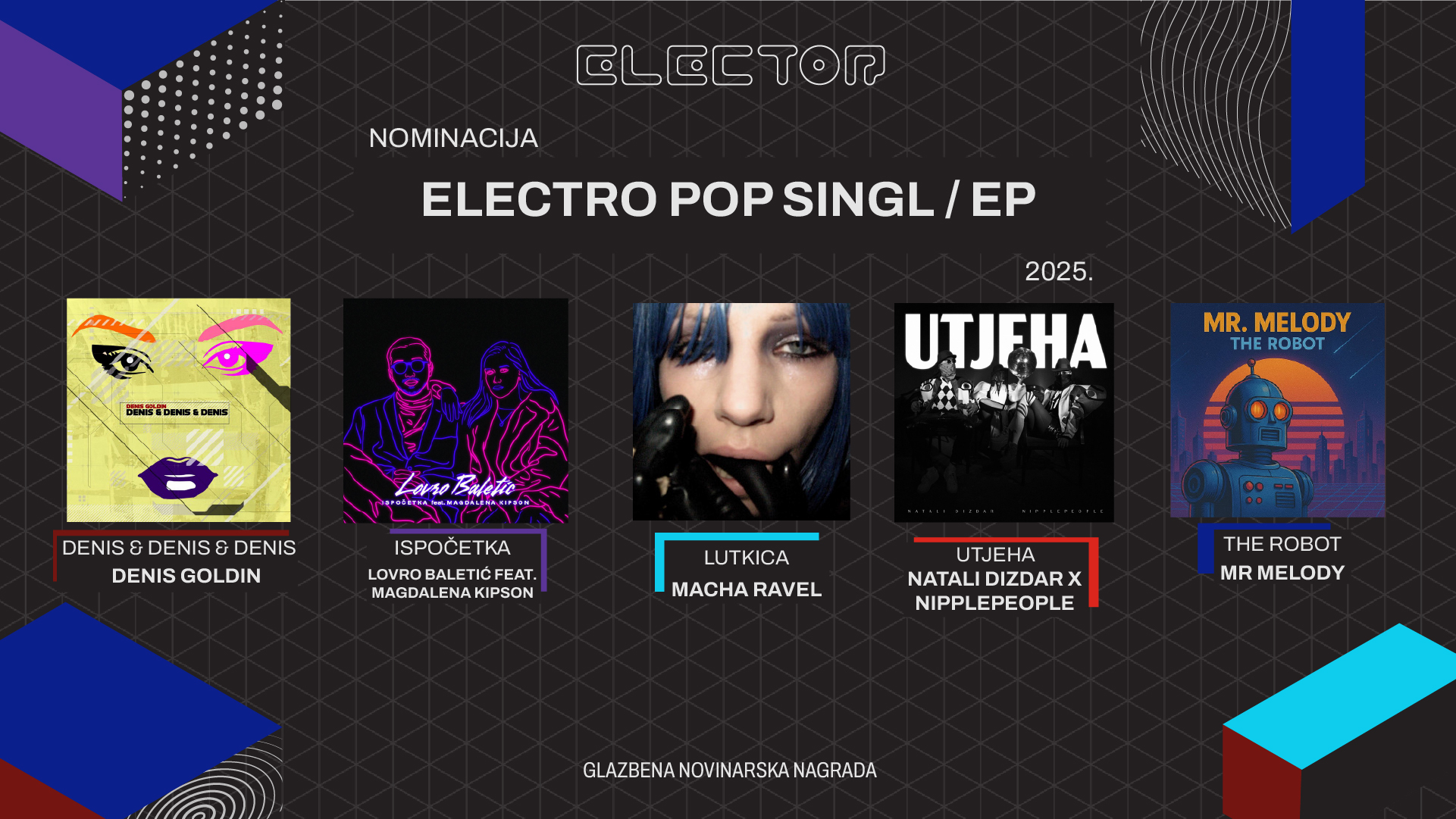Electro pop kategorija ove je godine jedna od najuzbudljivijih u sklopu nagrade ELECTOR. U konkurenciju ulaze sva izdanja koja obuhvaćaju široki spektar electro pop podžanrova – od synth i dance popa, preko minimal wavea i future popa, pa sve do italo-disca. Pravo sudjelovanja imaju izdanja domaćih i inozemnih diskografa, kao i singlovi objavljeni u vlastitom izdanju.