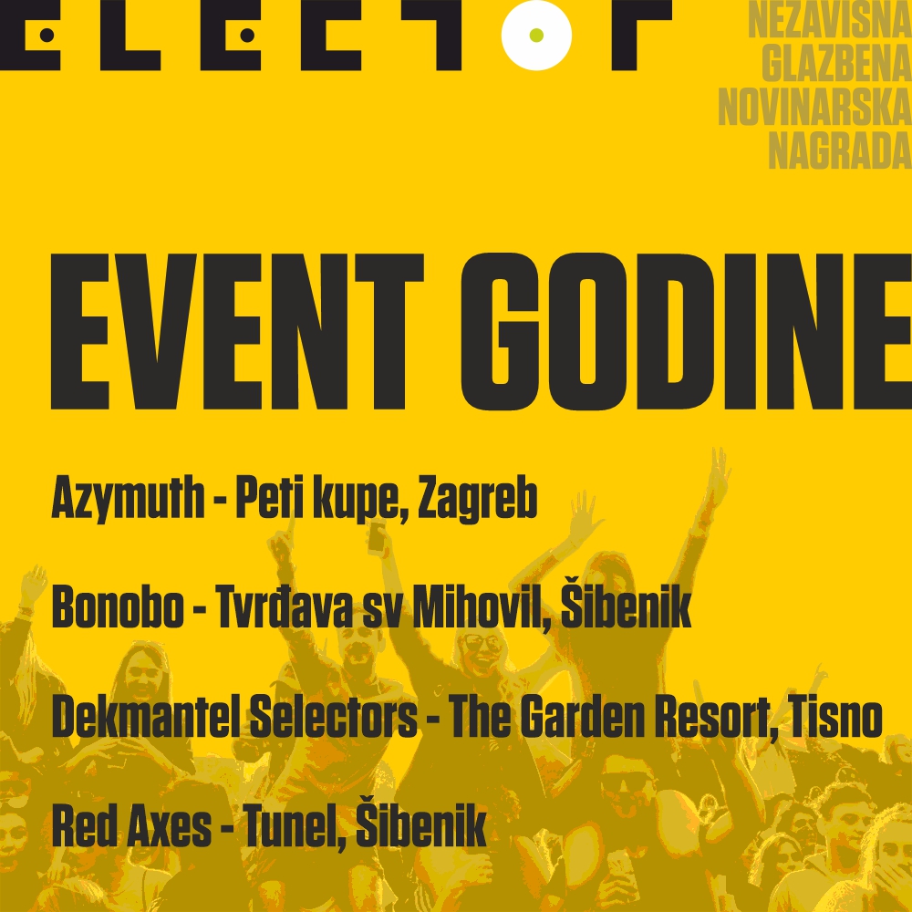 Događanja uživo su ključ i vrhunac oblikovanja glazbene scene, svojevrsno finale i svrha svega što se odvija u studijima, na probama, pa i u umovima umjetnika. Glazbenicima su klupske večeri, festivali i koncerti nerijetko najvažniji dio djelovanja jer upravo tamo najneposrednije stvaraju vezu s publikom, dobivaju feedback na svoj rad te materijaliziraju ideje. Organizatori evenata zbog toga nose veliku odgovornost da osiguraju optimalne uvjete za stvaranje nezaboravnih trenutaka, što je prilično kompleksan posao koji, osim razmišljanja o samoj suštini svega – glazbi – uključuje i brigu o zvuku, svjetlu, logistici, marketingu, sigurnosti, prostoru, vibri... Žiri ELECTORA procijenio je da su u 2023. godini brojni od njih uspjeli dosegnuti faktor x i napraviti vrhunska događanja, pa je kategorija Event godine bila jedna od onih s najviše nominacija, a u finale nagrade dospjeli su Azymuth u Petom kupeu, Bonobo na Tvrđavi sv. Mihovila, Dekmantel Selectors u The Garden Resortu i Red Axes u Tunelu.