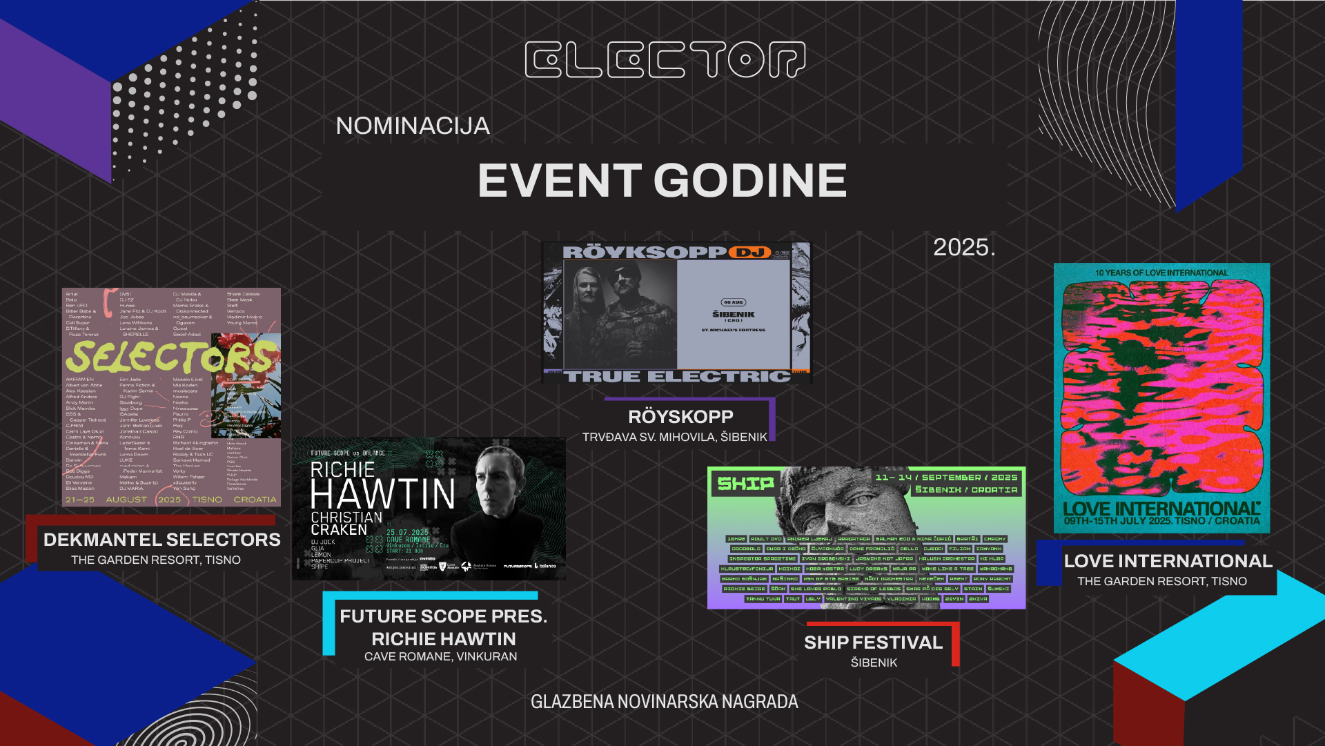 Elektronička glazbena scena u Hrvatskoj prošle godine zablistala je raznovrsnošću i snagom – od intimnih partyja, preko velikih koncerta pa sve do festivala na otvorenom. Od urbanih hotspotova u gradovima do magičnih lokacija na obali, ovi eventi okupili su tisuće fanova elektroničke glazbe iz zemlje i svijeta. Izabrati Event godine za nagrade Elector nije jednostavno, ali ova petorka ulazi u finale za prestižnu statuu.