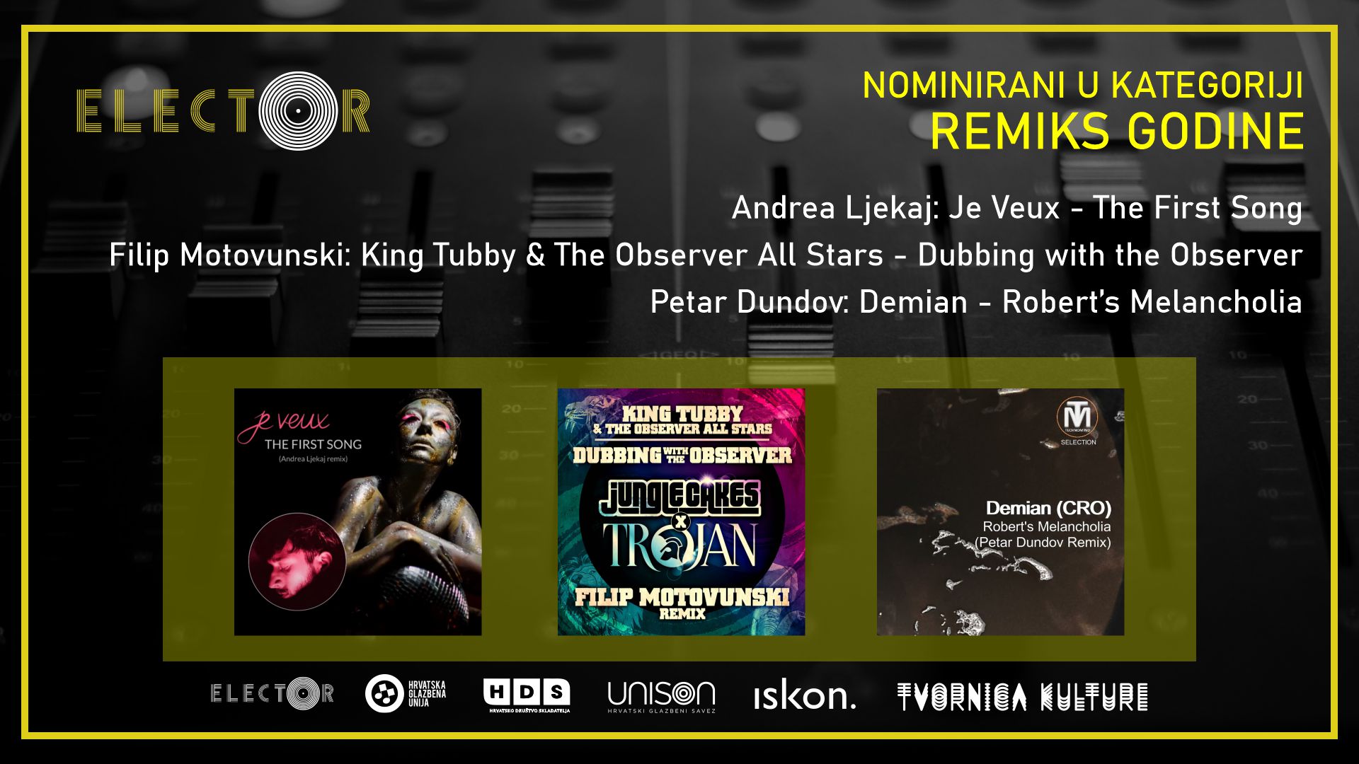 Pred žirijem sastavljenim od 20 novinara relevantnih domaćih medija koji prate elektroničku scenu nije bio lak zadatak, a tri remiksa dobila su čast natjecati se za najbolji u protekloj godini.